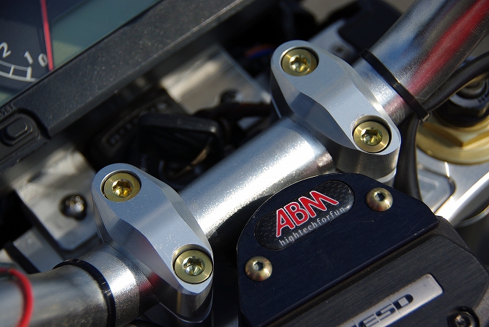 | ◆ドイツ製らしい品のあるデザイン ABM製のトップブリッジは、角ばった武骨なデザインが特徴の国産品とくらべ、コーナーがアールでデザインされていることで、しっとりしたアダルトな品格を醸しだしております。 ◆強度の違いが分かる人々に愛されています ABM製のトップブリッジは、バーハンドルを取り付けることを前提に設計されていないノーマルトップブリッジに対して、見た目の美しさだけではなく、非常に高い強度で設計されていますので、チャタリング等を気にするジムカーナJAPAN代表の作田隆義選手他、多くのライダーに愛用されています。 |