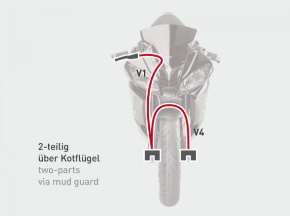 ブレーキホースの取り回しは、 『h』字取り回しで、 これは主にスズキ車などによく見られる、 1本目がマスター〜右キャリパー、 2本目が右キャリパー〜左キャリパーへと、 フェンダーをまたいで取り回す方法ですので宜しくお願い致します。 |