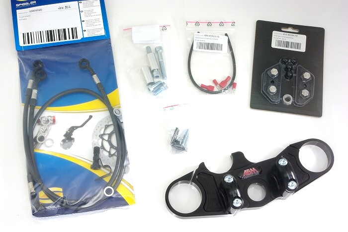 | ★『バーハンドル化用ベーシックキット』キット内容 ・バーハンドル化用トップブリッジ ・延長フロントステンメッシュホース ・リザーブタンク移動の為のネジやステー ・ホーン移設の為のコード ・フェアリングスペーサーキット ★推奨ハンドル ・スーパーバイク0229バーハンドル ★取り付け上の注意 ・要スクリーンカット |