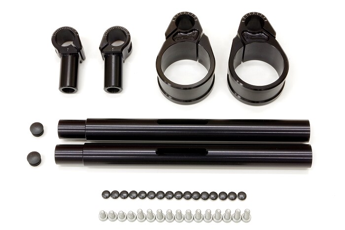 | 【使用上の注意】 ・ハンドル位置を決定した後は、フロントフォークを伸ばし切った状態にてブレーキホースやクラッチケーブル(もしくはクラッチホース)等の長さの確認をして頂き、長さが不足する場合には、別途延長したブレーキホースやクラッチケーブル(もしくはクラッチホース)等をご購入して対処して頂きたく宜しくお願い致します。 ・装着車両によっては、ハンドルを切った際にカウルやタンク等にハンドルバーやレバーやスイッチボックス等のハンドル周りのパーツが干渉する場合がありますので、その場合にはハンドルストッパー等を追加して対処して頂きたく宜しくお願い致します。 |