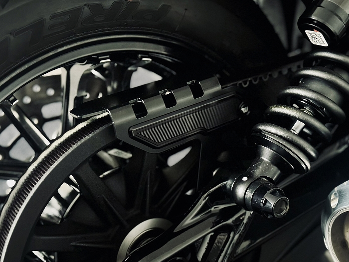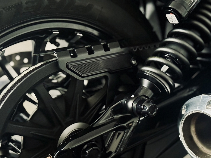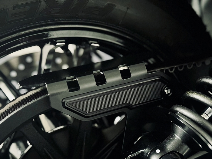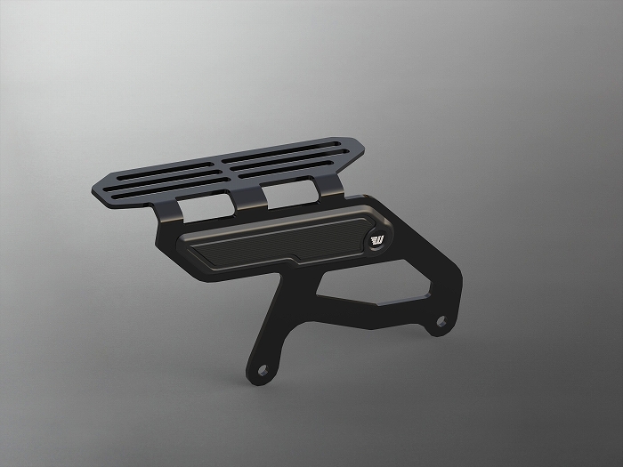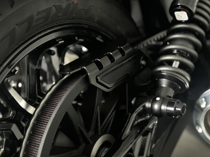 | ◆製品の特徴 ● 純正と同じ場所に取り付け可能です。 ● ベルトガードはステンレス製のブラックサテン仕上げです。 ● サイドにはCNC削り出しのクールなカバーが装着されています。 |