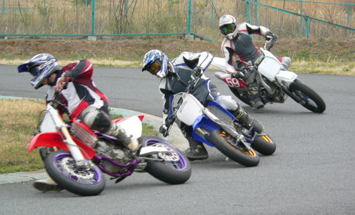 | どんだけ走らせてんだっつうくらい周回しても、全然タイヤが温まる気配が見えず、全然フルバンク出来ない私。特に左コーナーは、ひとつしかないので、少し倒しこむだけでスリップし、まるでウェットの中を走っているようです。恐らく、このタイヤならば、アルファー10とかクオリファイヤーとかの、温度依存性の少ないタイヤのほうがグリップするという感じで、ツーリングタイヤよりも食わないタイヤに面食らいました。あ〜あ、裏目に出ちゃったよダメロップ。(泪) |
